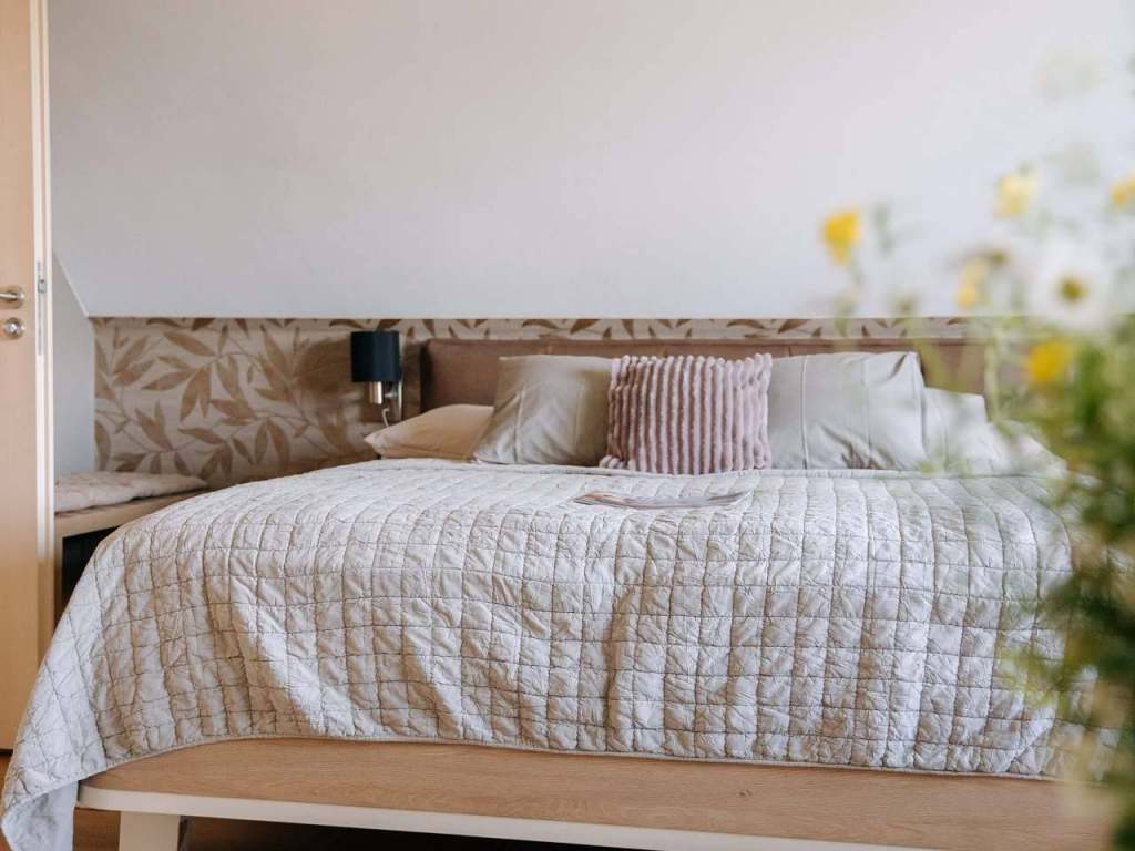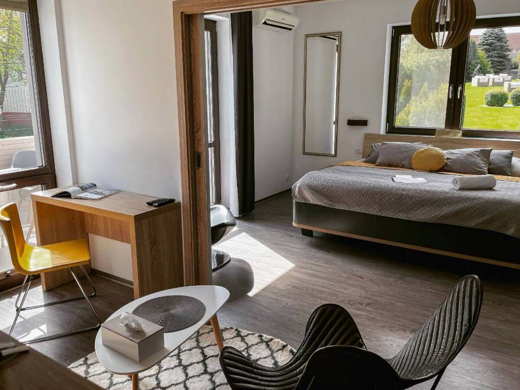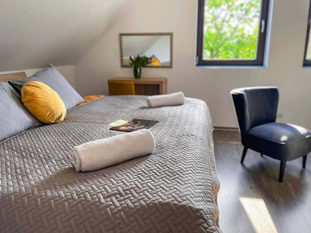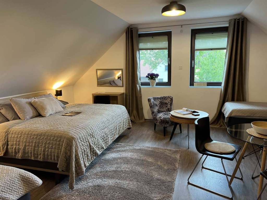evokují klid a pohodu. Vyspí se zde pohodlně i čtvrtá osoba. Jsou to pokoje s designovou postelí a zdravotní matrací pro rodiny, ale i páry v klidné části.