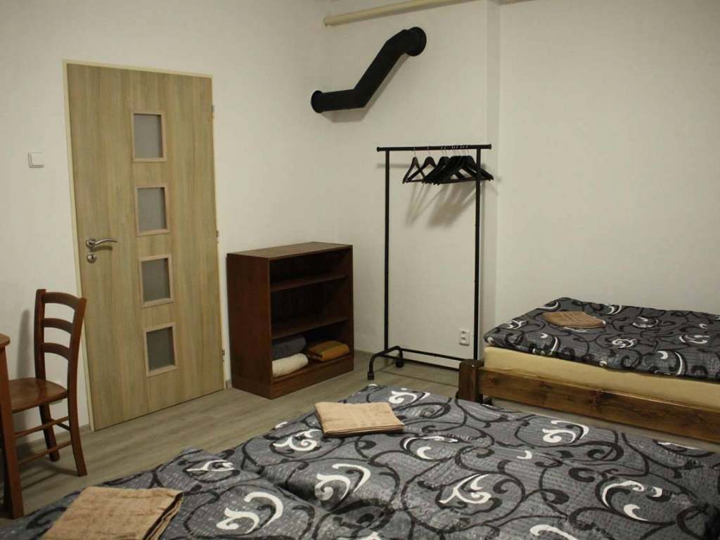 Ložnice: lůžkoviny, stojan na oblečení s ramínky, policová skříňka, stůl a tři židle.