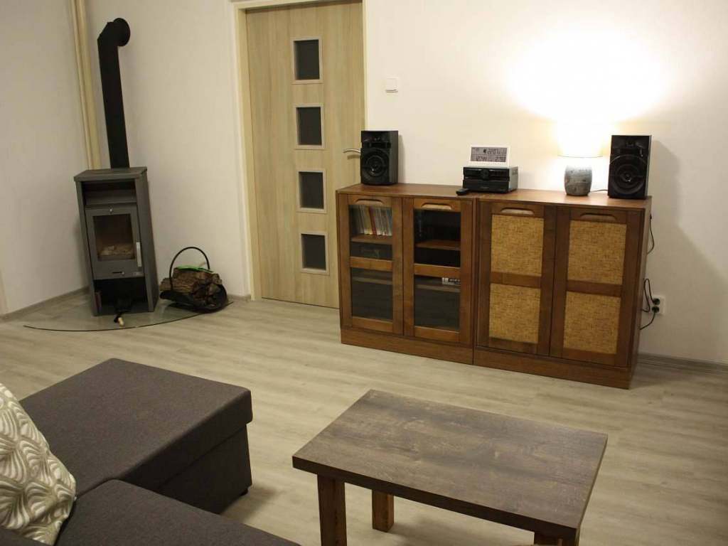 V obývací místnosti je k dispozici rozkládací pohovka, na které se pohodlně vyspí dva lidé, lůžkoviny máme připravené. Ostatní vybavení pak vidíte na fotografiích. K příjemní atmosféře přispívají mimo jiné krbová kamna s prosklenými dvířky, květiny na parapetech oken a tlumené osvětlení. K dispozici jsou knížky a také stolní hry, které postupně doplňujeme. Na fotografiích ještě není sedací vak, ale plánujeme jej co nejdříve pořídit. Za pohovkou je pak takový malý herní prostor pro děti, který postupně dovybavujeme.