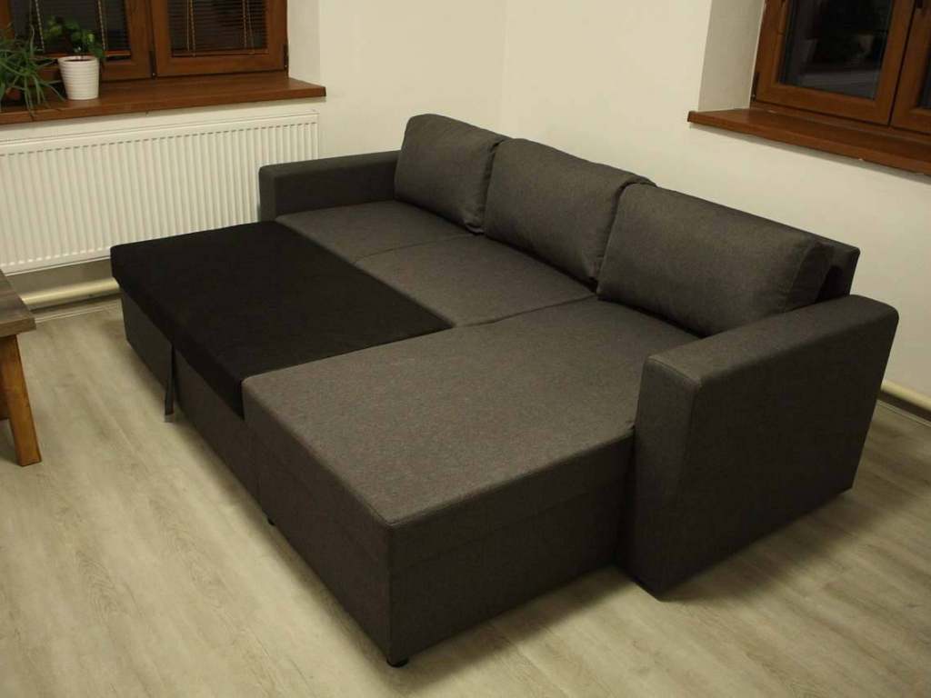 Obývací prostor: rozkládací pohovka ve tvaru L (pohodlně se na ní vyspí dva lidé), konferenční stolek, skříňky, deskové a další hry, knížky, ve dřevěné truhle hračky pro děti, lampička, zařízení na přehrávání hudby.