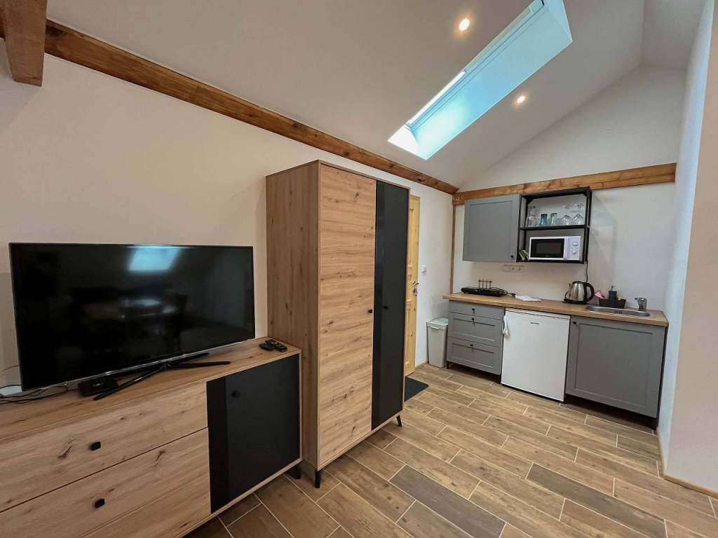 V bytě můžete najít kuchyň, která je vybavena malou lednicí, mikrovlnkou, varnou konvicí a dvouvařičem. Je také k dispozici televize a internetové připojení, které nikdy nezklame.