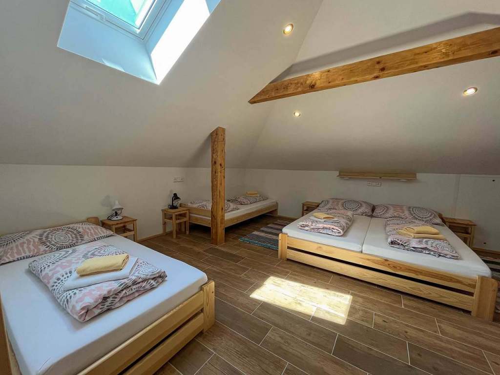 V ložnici apartmánu můžete najít jednu manželskou postel, tři jednolůžkové postele. Další jednolůžko je umístěno ve vedlejším pokoji pod oknem.