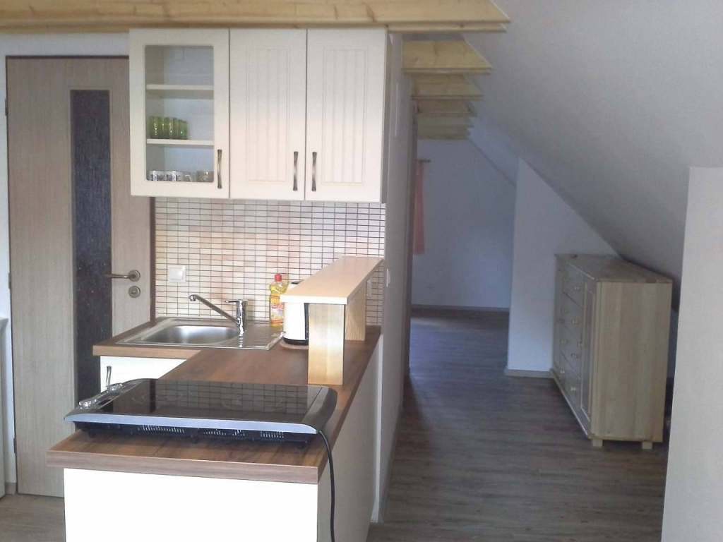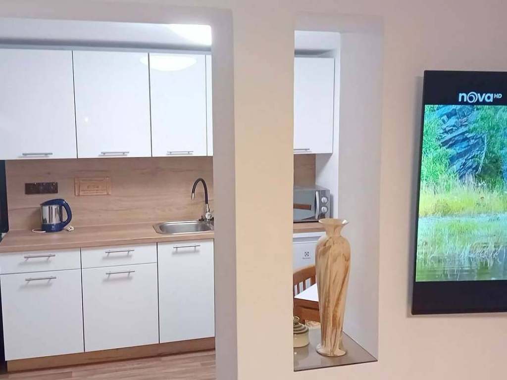 V přízemí i v podkroví jsou plně vybavené kuchyně s lednicí a mikrovlnou troubou, varnou konvicí, indukční deskou nebo sporákem, jídelním stolem se židlemi.