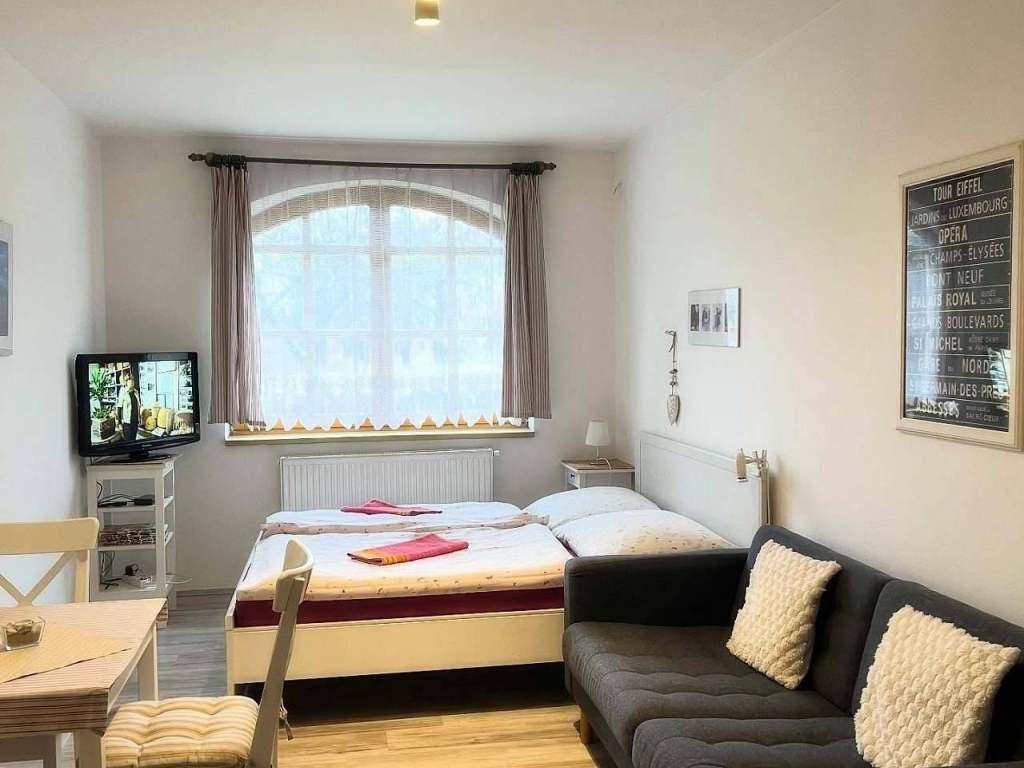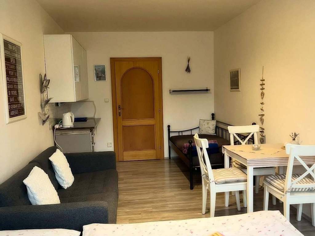 Apartmán s vlastním vchodem, velkou koupelnou se sprchovým koutem, samostatná toaleta, kuchyňský kout (dřez v koupelně z technických důvodů) na jednoduché vaření nebo přípravu studené kuchyně - dvouplotýnkový elektrický vařič, mikrovlnka, velká lednice, rychlovarná konvice, toustovač, nádobí. K apartmánu náleží vlastní zastřešené venkovní posezení s výhledem do zeleně. Apartmán je oddělen od ostatních částí velkého rodinného domu, ve kterém bydlíme spolu s manželem a psí slečnou Miou.