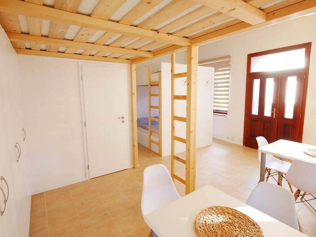 Pokoj pro 4 osoby: manželská postel, dvoupatrová postel, koupelna se sprchovým koutem nebo vanou, WC, povlečení, ručníky, hygienické potřeby, sdílená kuchyňka s jídelním stolem, soukromá zastřešená terasa.
