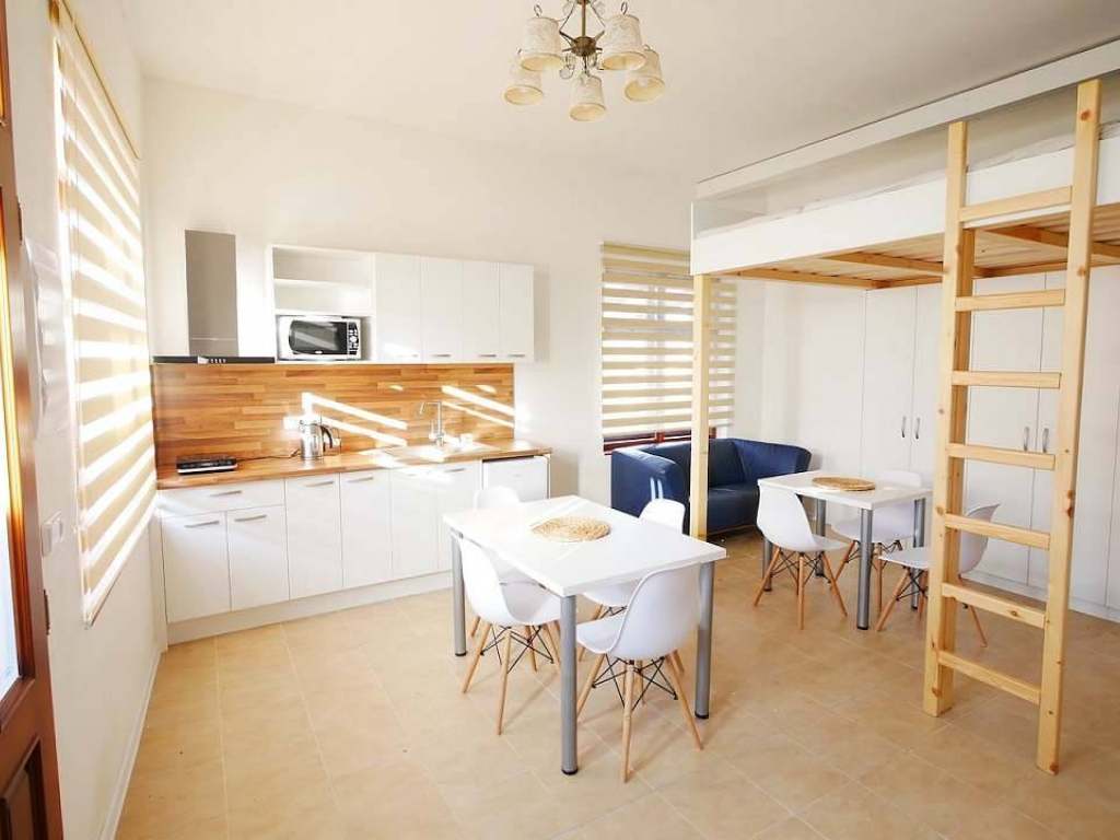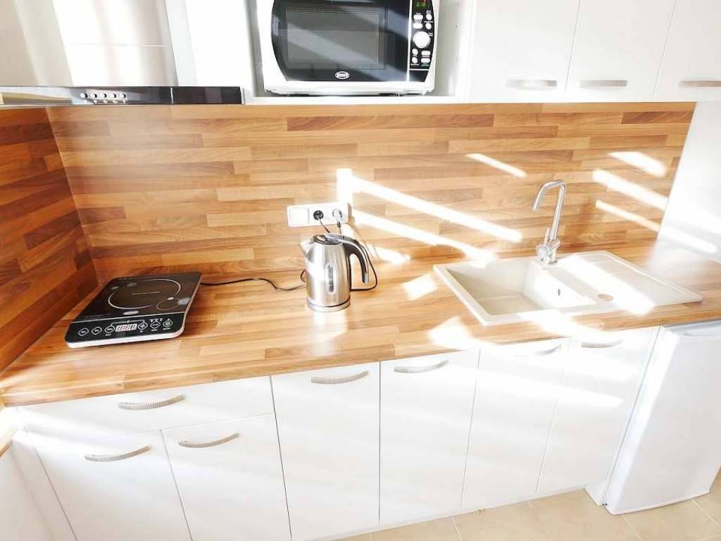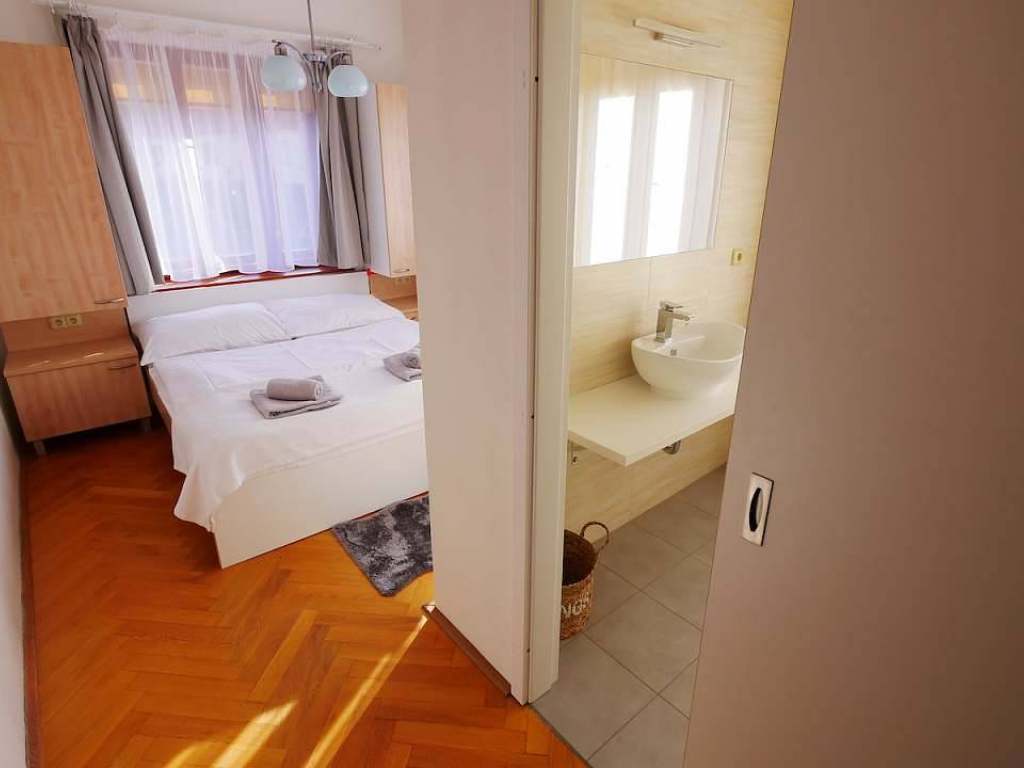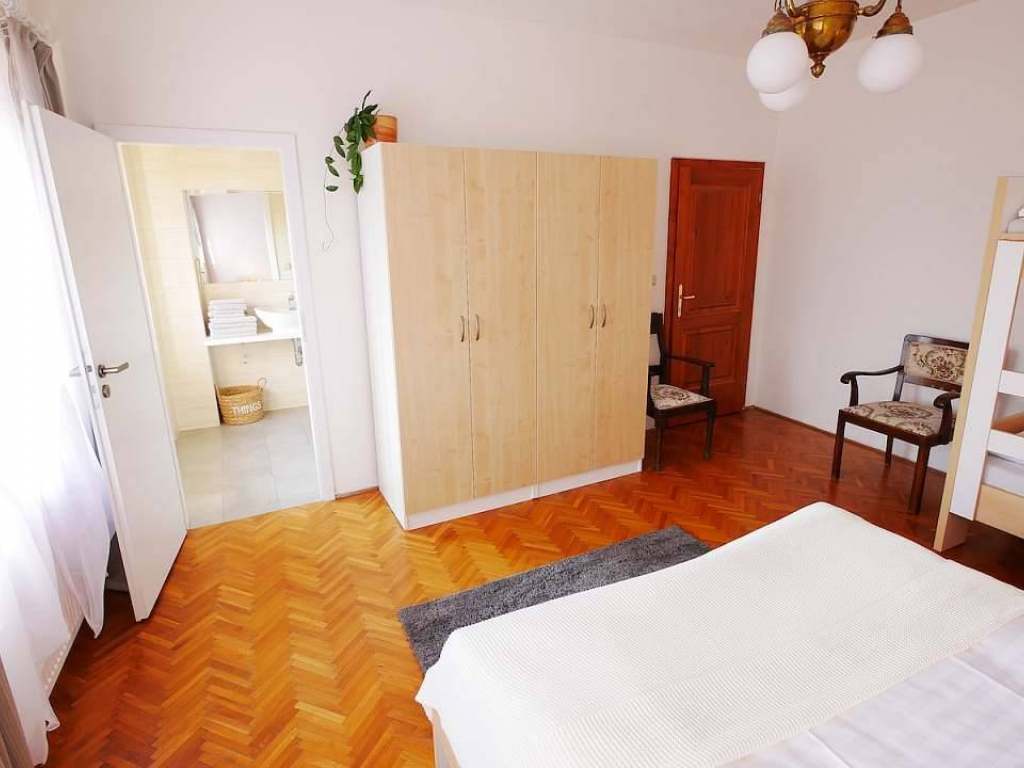Pokoj pro 4 osoby: manželská postel, 2x vyvýšené lůžko, možnost přistýlky, koupelna se sprchovým koutem + WC, kuchyňský kout (lednice, mikrovlnná trouba, indukční varná deska, kuchyňské vybavení, jídelní stůl), povlečení, ručníky, hygienické potřeby.