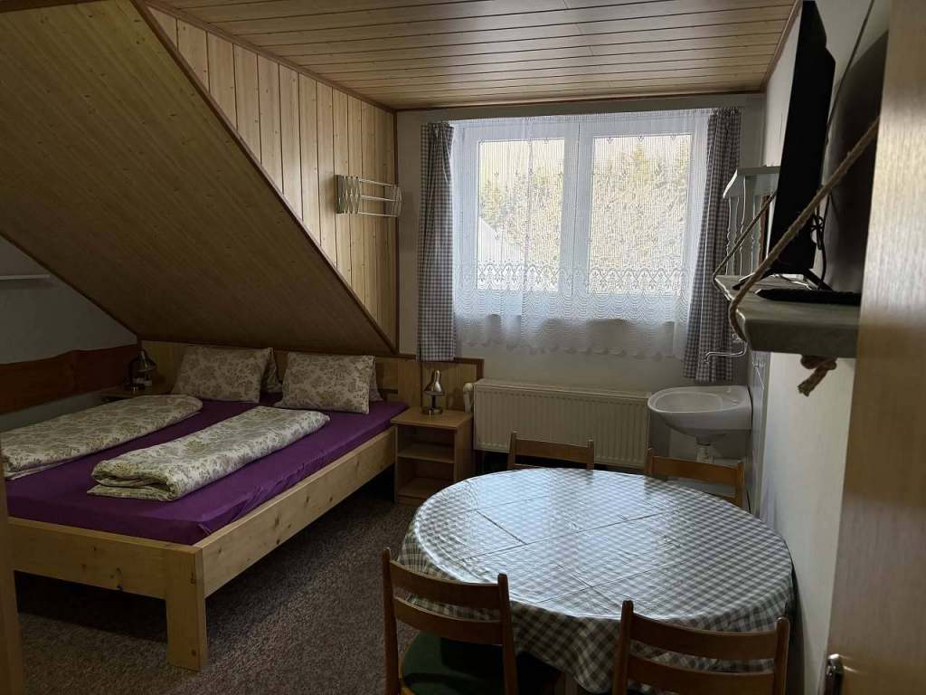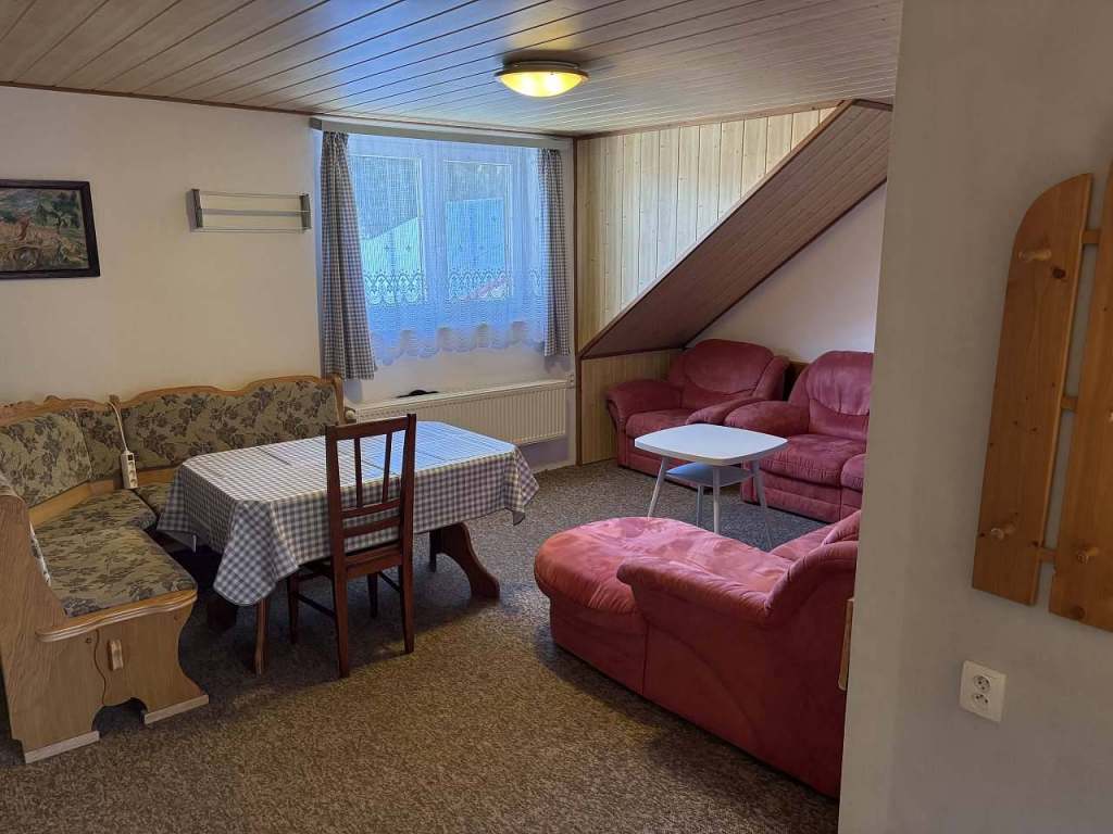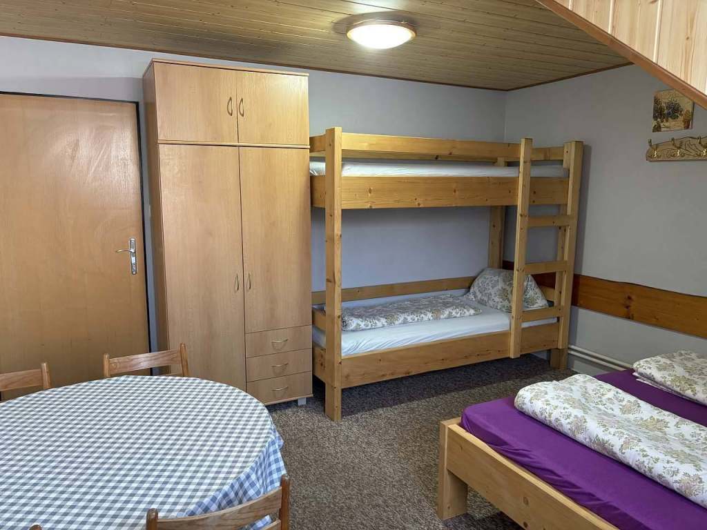 Apartmán se nachází v podkroví. Společenská místnost pro společné posezení. 2 ložnice jedna - 5 lůžek s balkónem, druhá - 4 lůžka. Ložnice jsou neprůchozí.