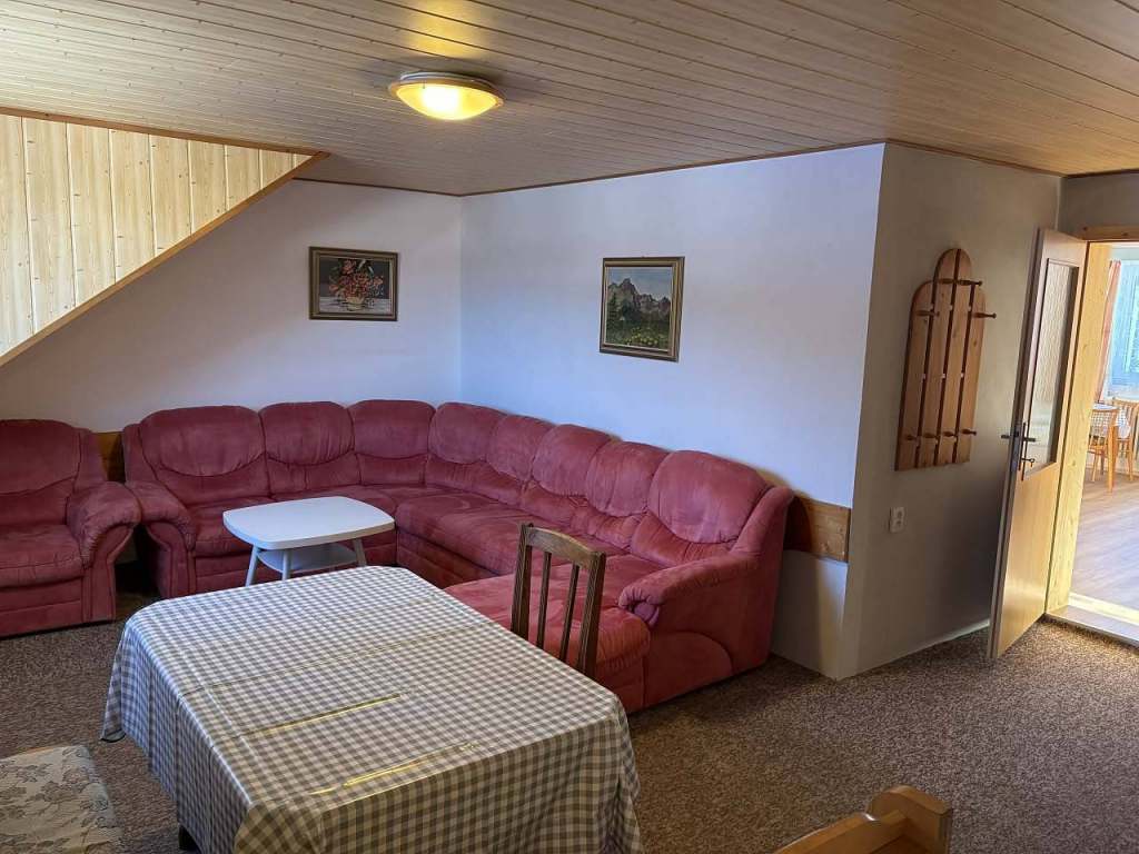 Nabízíme: Apartmán v podkroví - Společenská místnost pro společné posezení a 2 ložnice: jedna - 5lůžek s balkónem., druhá - 4 lůžka. Ložnice jsou neprůchozí.