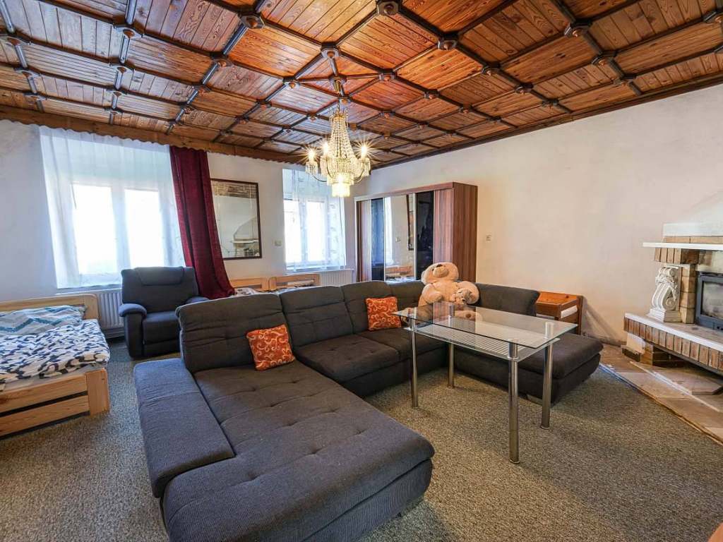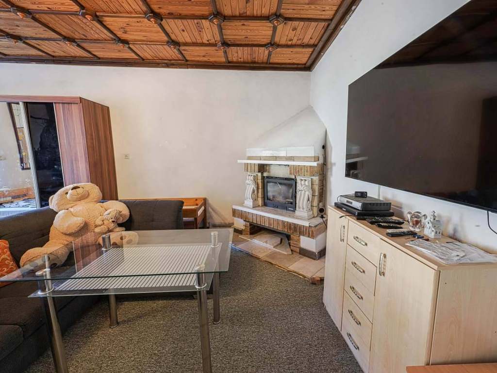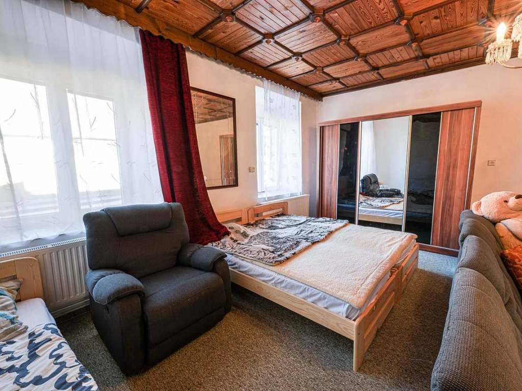 Apartmán č. 1 v přízemí: Obývací místnost s rozkládací pohovkou (přistýlka pro 2 os. ), jednolůžkem, dvoulůžkem, krbovou vložkou a TV. Ložnice s dvoulůžkem a TV. <br>