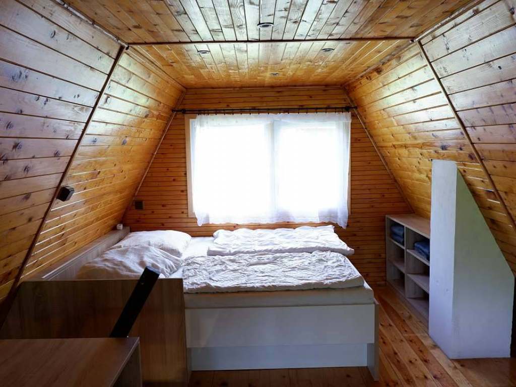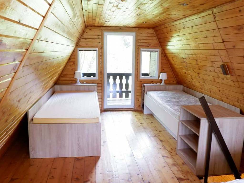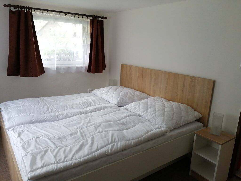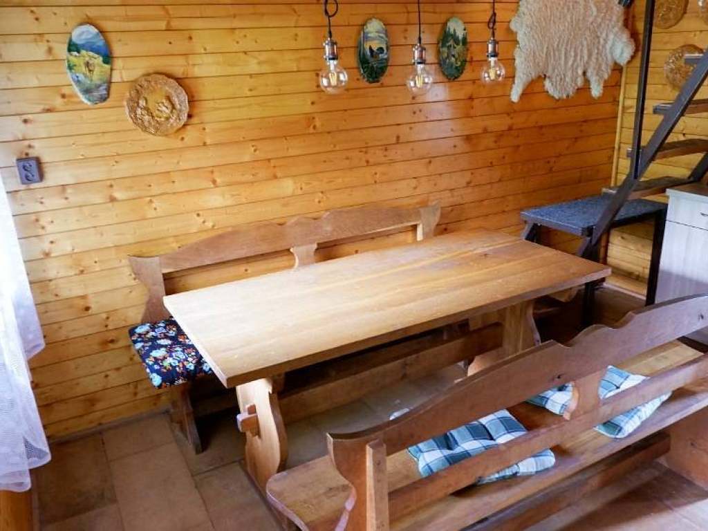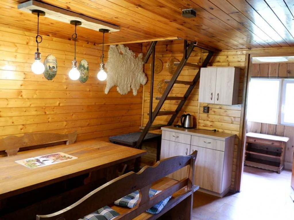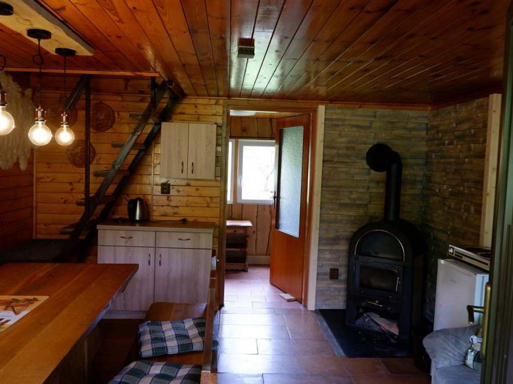 Ubytování v nově rekonstruované dřevěné chatce: podkrovní pokoj, 4 lůžka, vybavená kuchyňka a koupelna, mikrovlnka, lednička, varná konvice, krbová kamna, balkón s krásným výhledem, vlastní vjezd a parkování.
