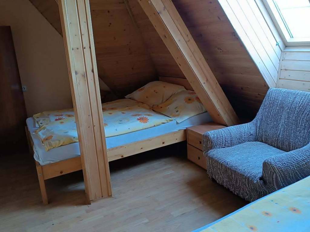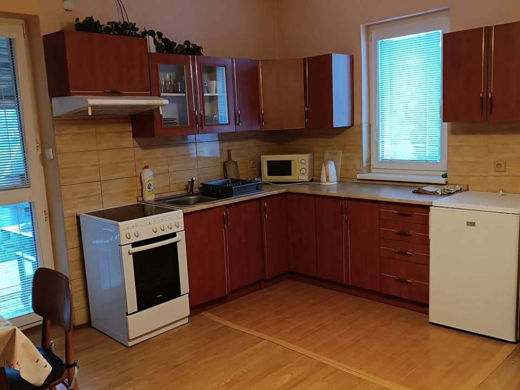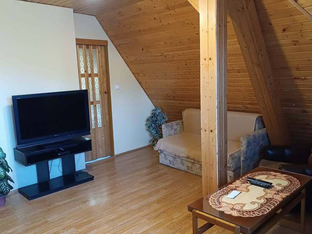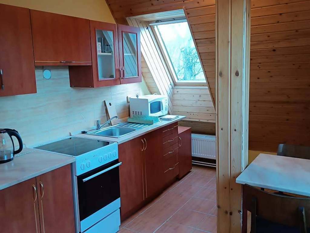 V patře vybavená kuchyň, koupelna s WC, obývací pokoj s možností přistýlky, pokoj tři postele.