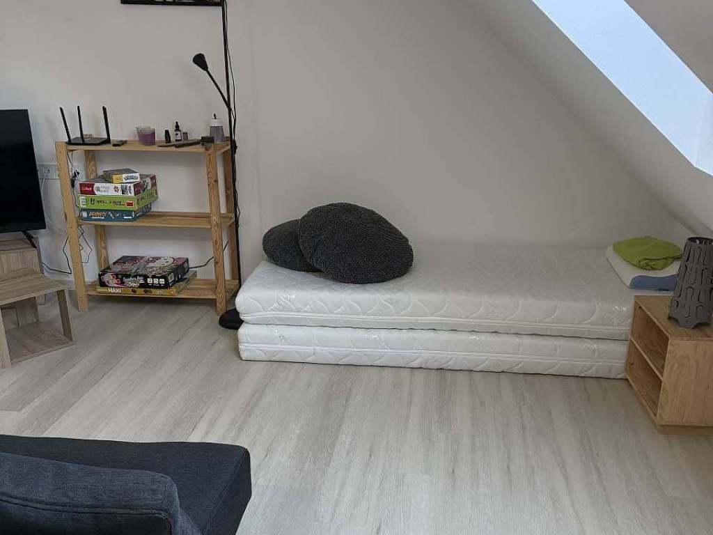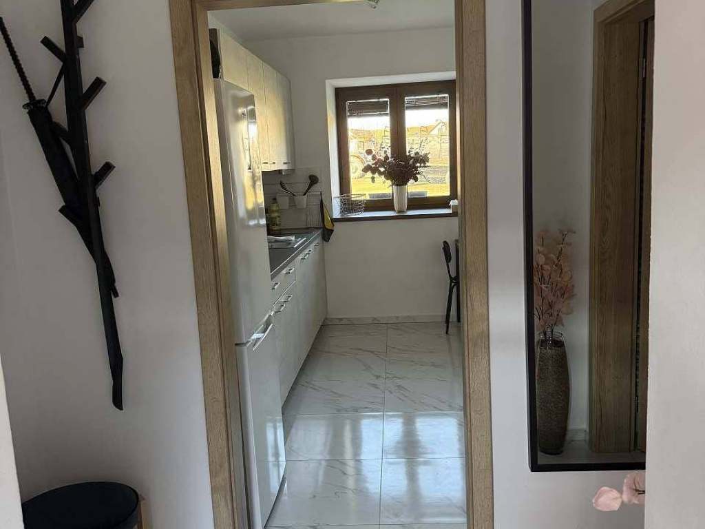 apartmán má vstupní chodbu, plně vybavenou kuchyňku s jednou(rozkládací) postelí a jídelním stolem. Součástí je samozřejmě koupelna se sprchovým koutem a WC. Po schodech nahoru se dostanete do prostorného pokoje s manželskou postelí za rohem, uprostřed místnosti je malý gauč, velká smart Tv a v rohu je další rozkládací postel.
