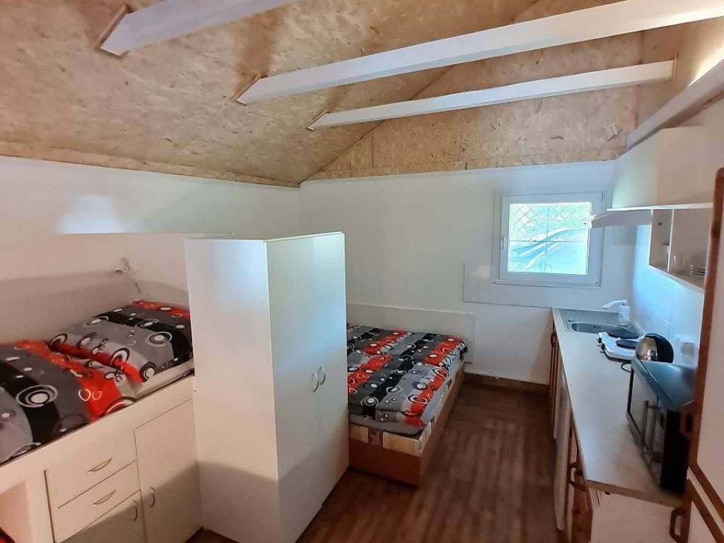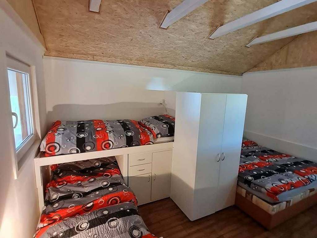 V každém plně vybavená kuchyňská linka s obývacím koutem, oddělená ložnici pro 4 osoby (letiště 2 x nad sebou, případně i 3 děti), uvnitř oddělené sociální zařízení s WC, umyvadlem a sprchovým koutem, na terase stůl, židle a botník. Nejsou bezbariérové. Ubytování včetně povlečení.