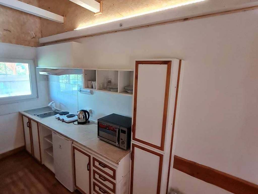 V kuchyň. lince je teplá a studená voda, dřez, odsávač par, dvouplotýnkový el. vařič, mikrovlnná trouba, varná konvice, lednička, nádobí na vaření a stolování, příbory, hrnky a skleničky, utěrka a prostředky na mytí. nádobí.