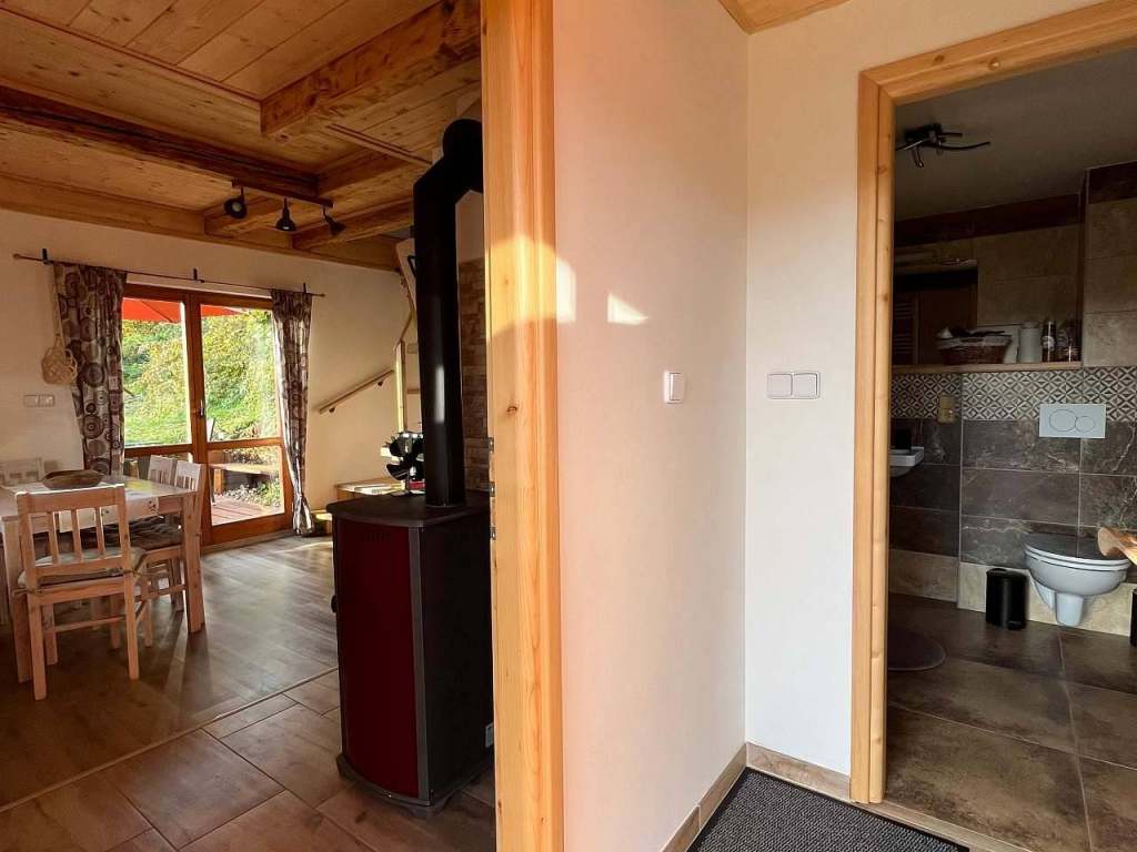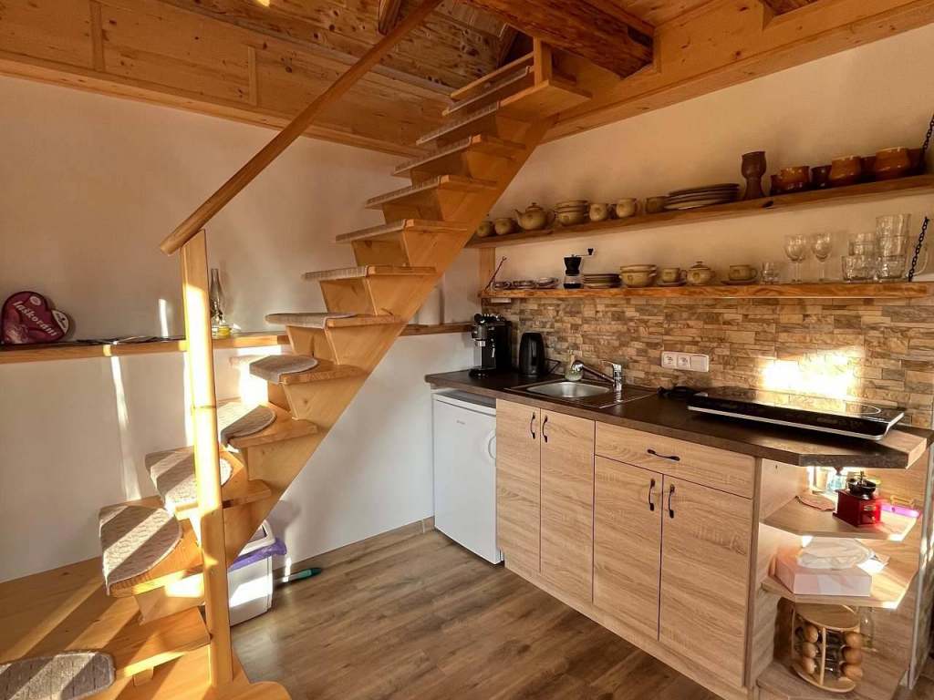 Chata je dispozičně řešena jako samostatný, malý patrový domek. V přízemí se nachází obývací prostor s kuchyní a vstupem na venkovní terasu, koupelna se sprchovým koutem a WC.