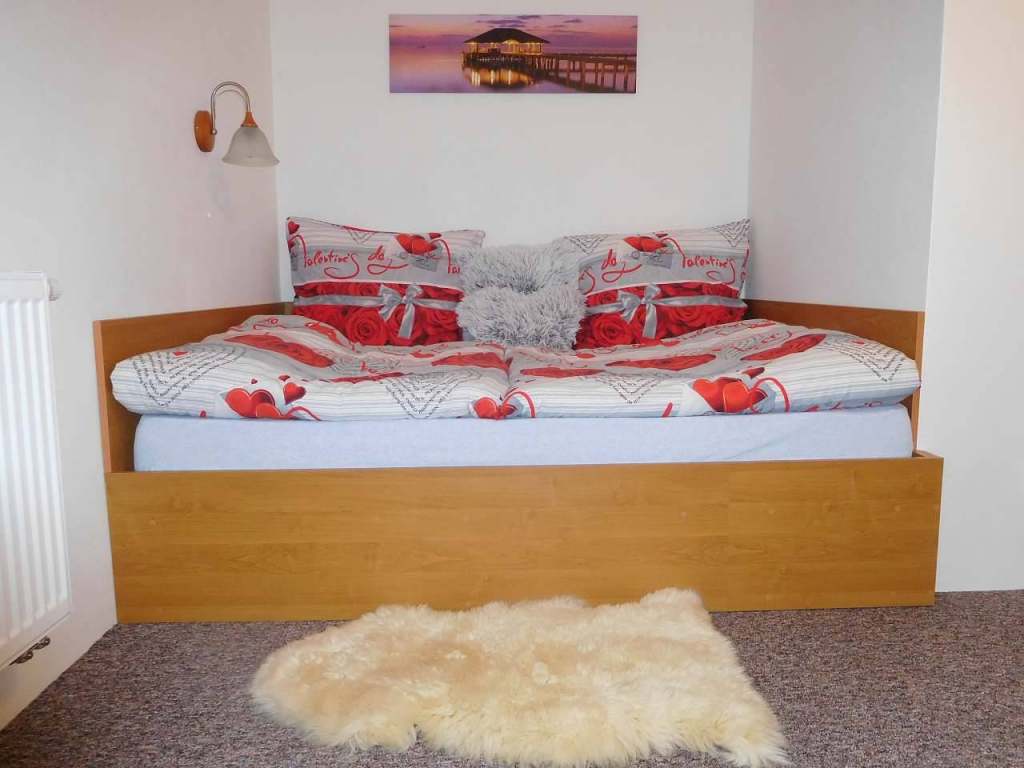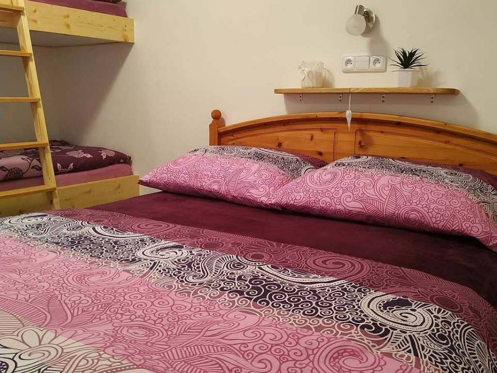 Apartmán 2 - Ložnice s manželskou postelí a patrová postel. V obyvacim pokoji rozkládací sedačka.
