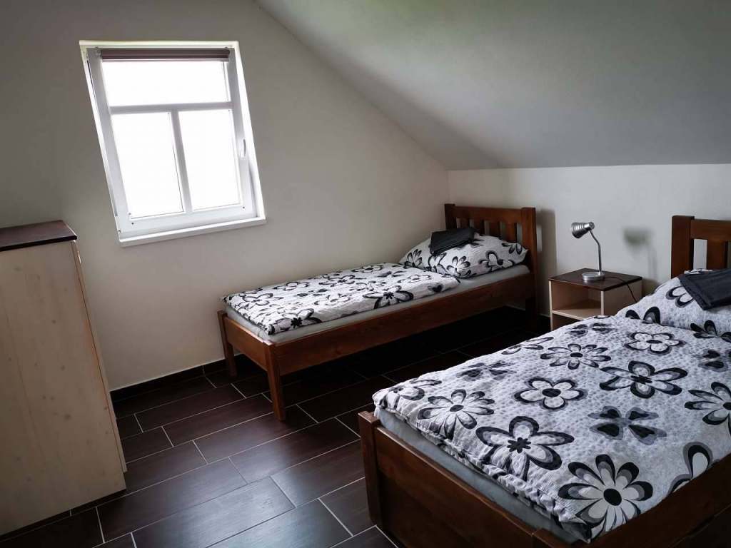 V podkroví jsou k dispozici 3 samostatné pokoje a koupelna s WC. První pokoj má 2 samostatná lůžka, druhý pokoj 1 dvojlůžko (manželská postel) a třetí pokoj 2 samostatná lůžka + 1 přistýlka. Lůžkoviny vč. povlečení a ručníky jsou v ceně ubytování.
