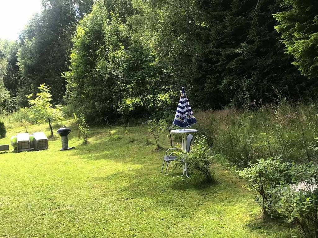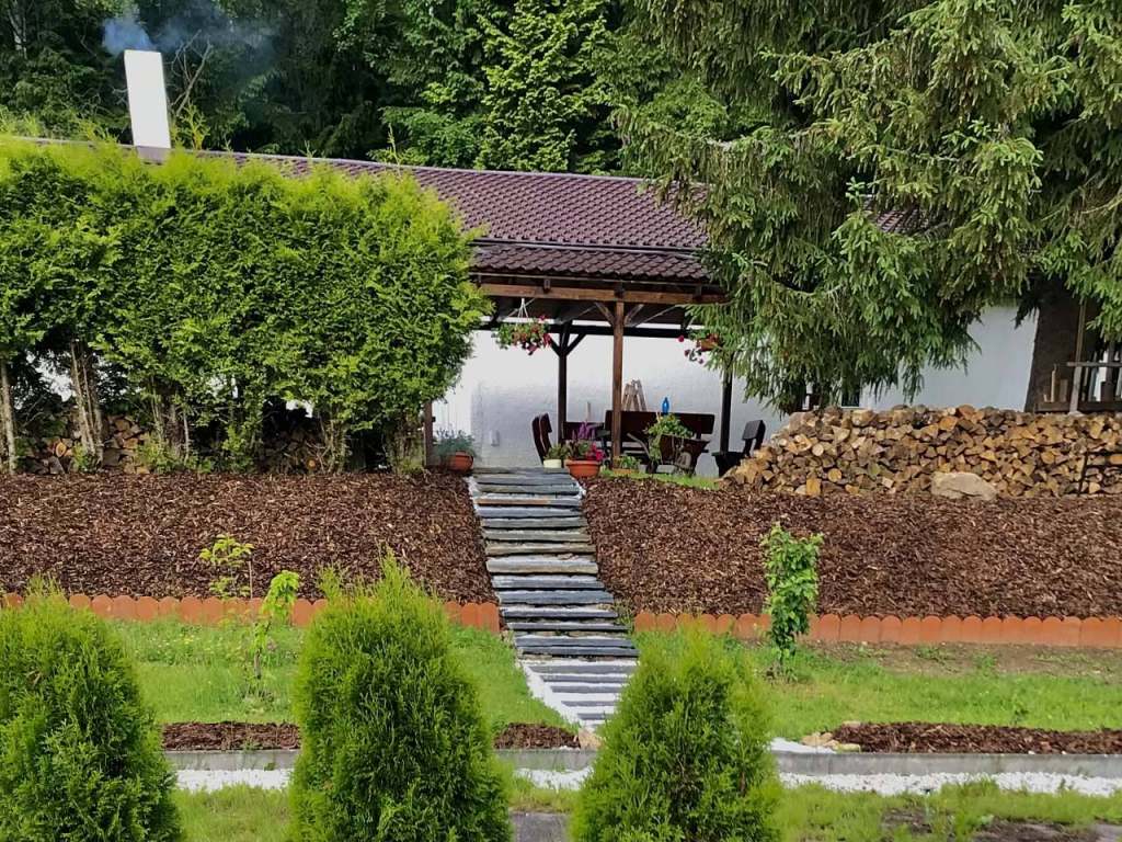 Okolí chalupy tvoří prostorný travnatý pozemek, který je osázen živým plotem. Za domem je les. Součástí pozemku je asfaltová plocha určená k parkování pro více aut.