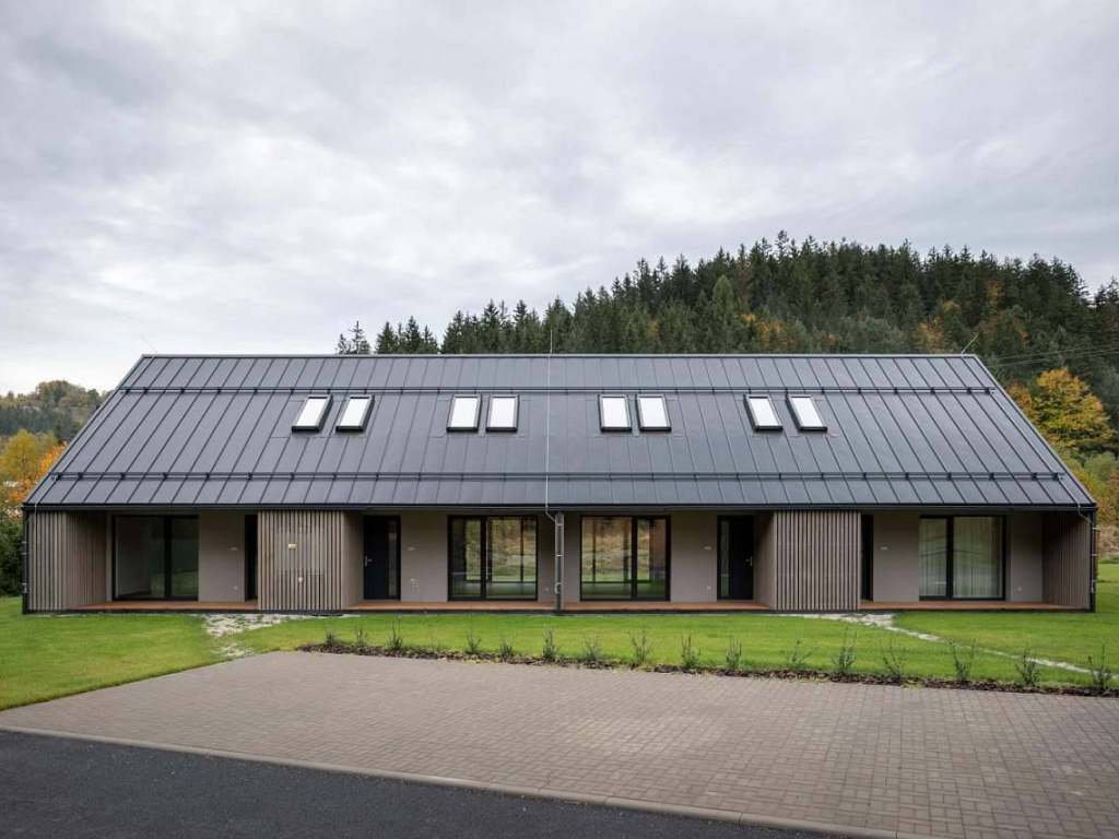V prvním nadzemní podlaží se nachází vstupní chodba, WC a hlavní obytná místnost s kuchyní a jídelnou. Na hlavní obytnou místnost navazují dřevěné terasy, které jsou navrženy po obou delších stranách objektu. Ze vstupní terasy je přístup do technické místnosti a menších zahradních skladů. Ze zadní terasy je přístup do větších zahradních skladů, které náleží jednotlivým bytům. Tyto sklady spolu s živými ploty tvoří pohledovou bariéru mezi bytovými jednotkami.