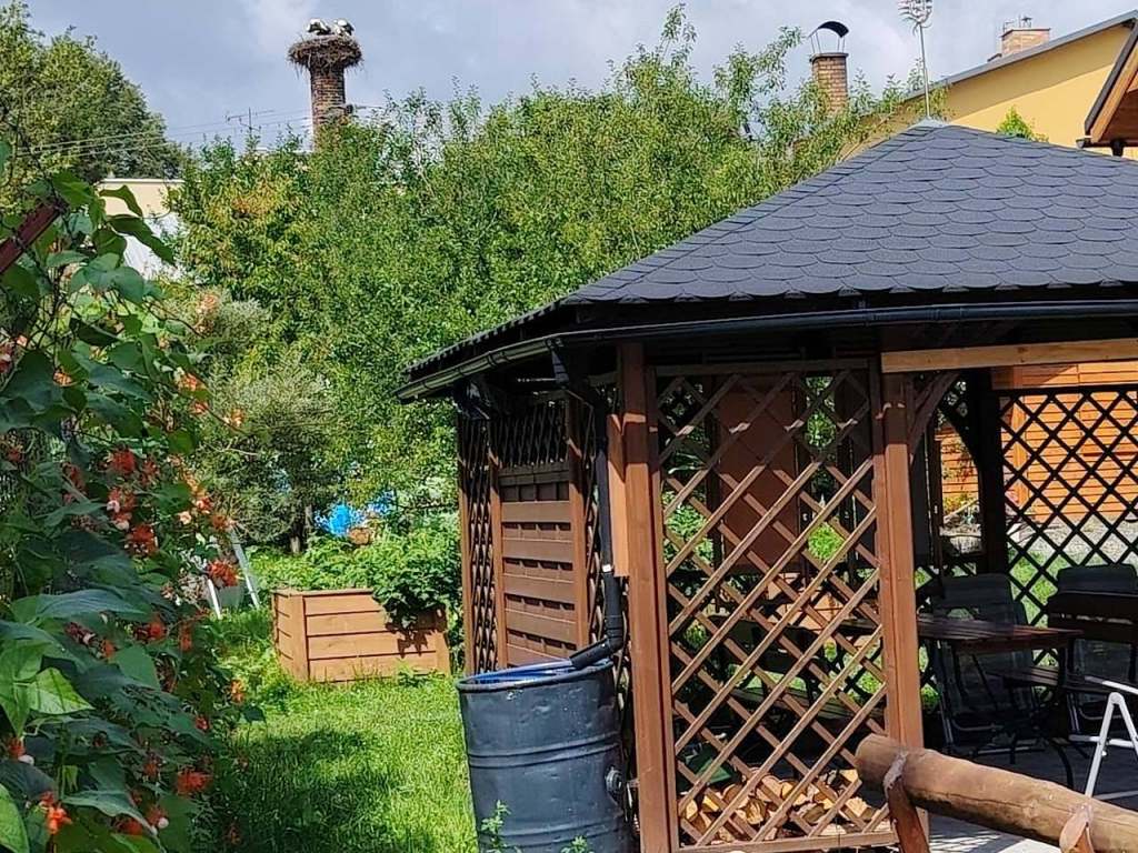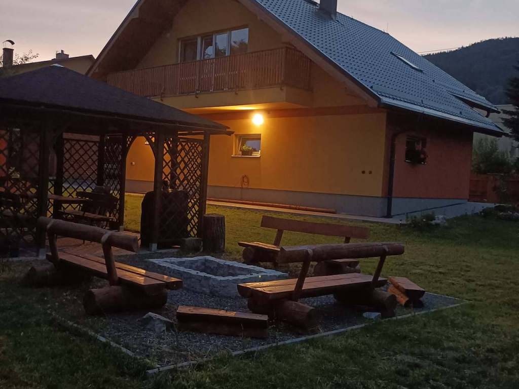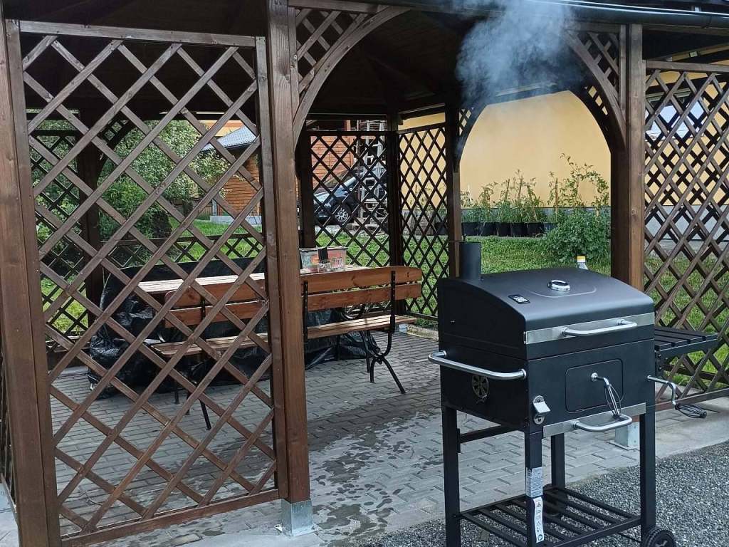U domu je zahrada, na které je venkovní posezení s ohništěm a pergola s přenosným grilem.