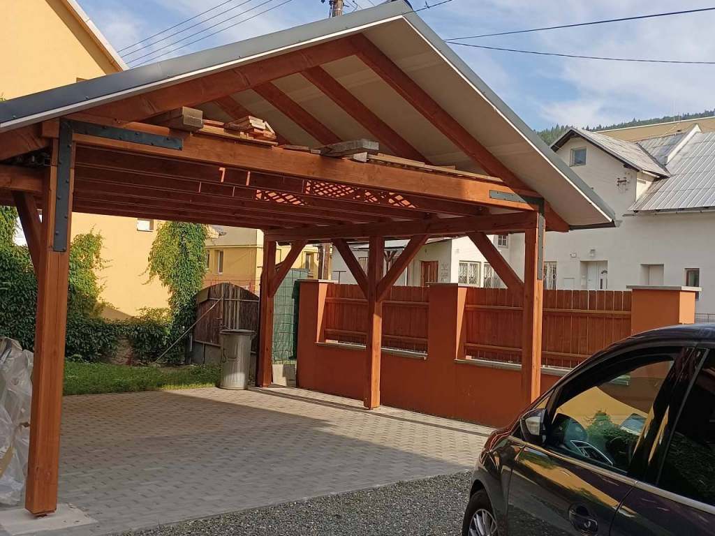 U domu je v oploceném areálu zajištěno zastřešené parkování pro dvě osobní auta.