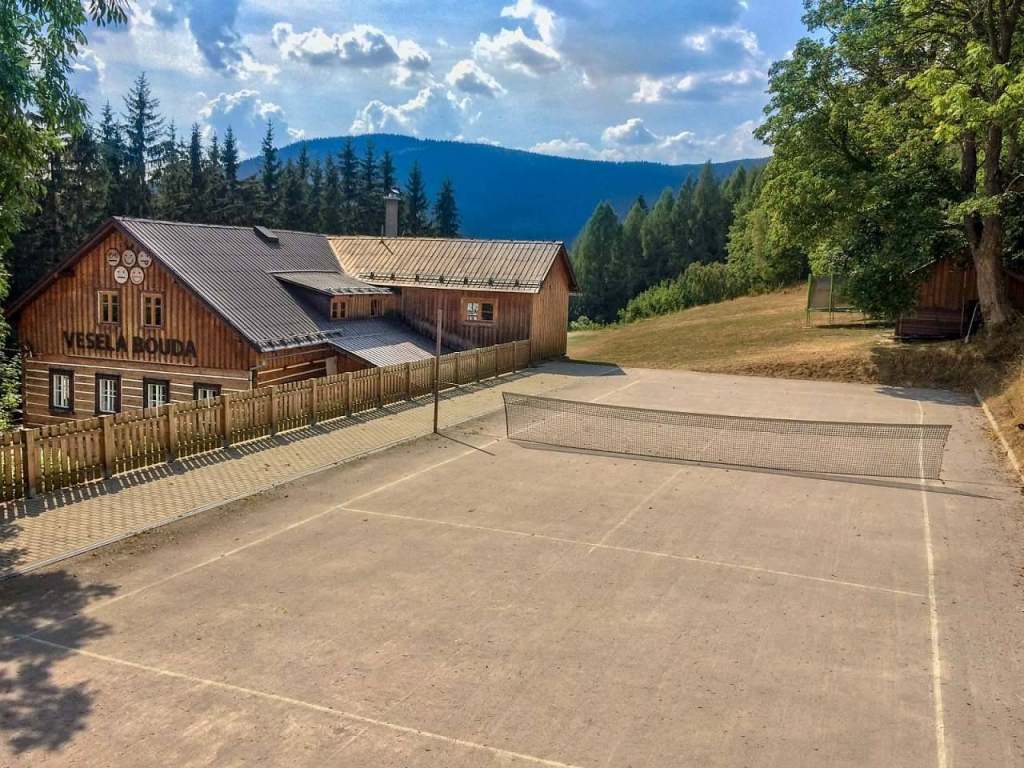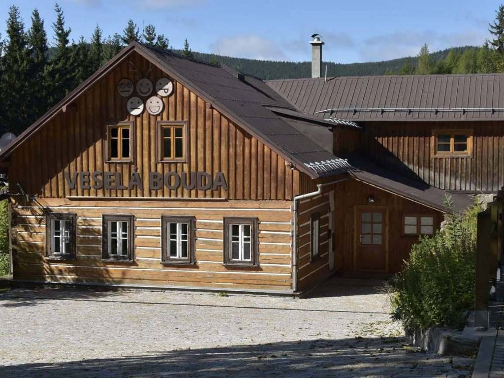 Veselá bouda nabízí 5 pokojů s vlastní koupelnou a WC, jeden třílůžkový a 4 čtyřlůžkové. Dva pokoje jsou situovány v prvním patře a tři jsou v přízemí vedle sebe. V hlavní místnosti je k dispozici bar s pivním chlazením, kávovar Nespresso, ozvučení s bluetooth připojením, stolní hry, stolní tenis, šipky, WiFi zdarma. Místnost s krbem leží na druhé straně a navazuje na venkovní terasu orientovanou na jihozápad.