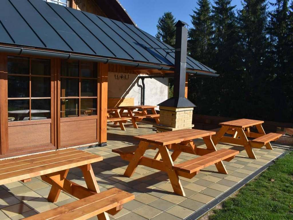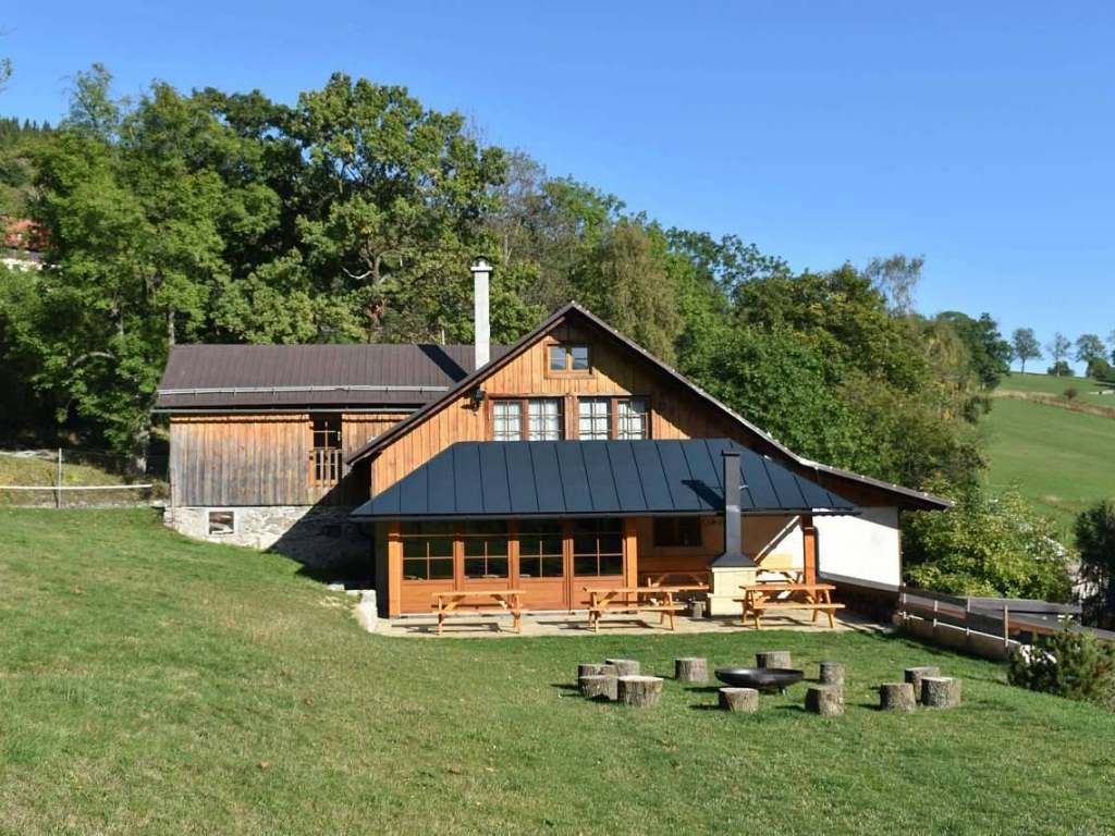 Sauna s odpočívárnou, na kterou navazuje vstup ke krytému bazénu, má výhled do lesa. Chata má vnitřní krb s posezením a klidnou terasu s venkovním krbem.