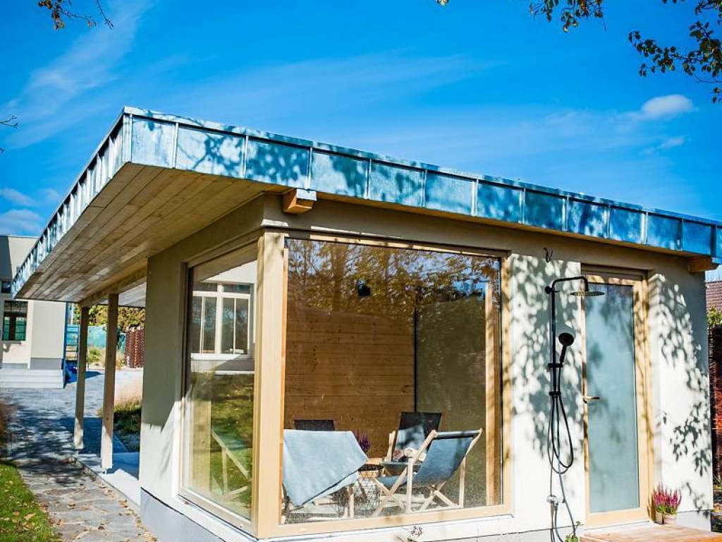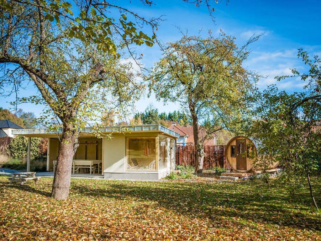 Venkovní sauna: Na zahradě se nachází venkovní sauna ve formě saunového sudu, která má kapacitu pro 4 osoby. Součástí pergoly je také odpočívárna se sprchovým koutem pro příjemný relax po saunování.