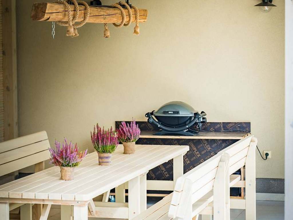 Pergola je otevřená a nabízí posezení pro hosty. K dispozici je elektrický gril a základní náčiní.