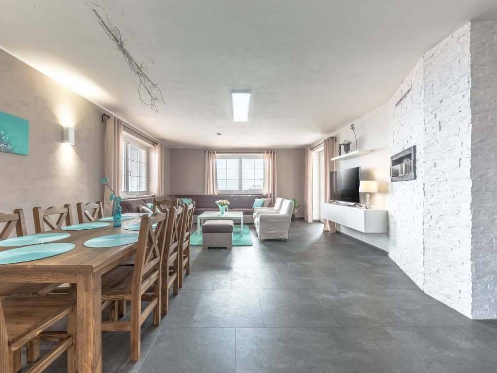 Vila má 7 ložnic, z toho 4 ložnice po 4 lůžkách a 3 po 2 lůžkách. V každé ložnici je koupelna se sprchovým koutem a wc. WC jsou též i při společných prostorech jako je fitko, sauna a společenské prostory v apart, č 1.V apart. č. 1 je velký obývací pokoj s velkou roh. sedačkou a velkým jídelním stolem, který je ideální jako společenská místnost. Z obývacích pokojů v apart. 1 a 2 jsou vstupy na lodžii a terasu, kde je v letních měsících venkovní sezení se slunečníkem.