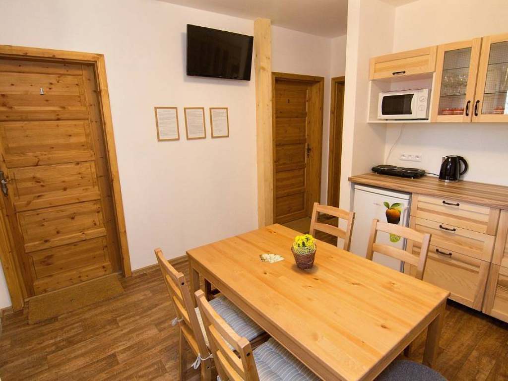 K dispozici jsou plně vybavené kuchyňky. Restaurace 300m. Snídaně lze připravit po dohodě.
