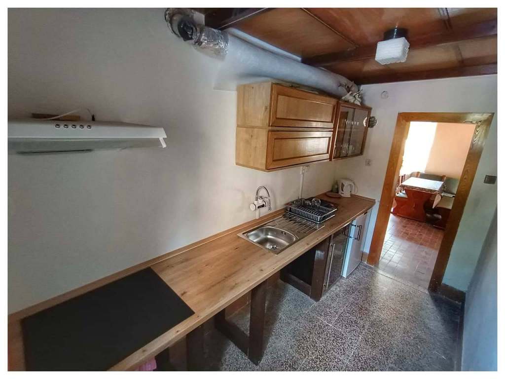 Kuchyně je vybavena sklokeramickou deskou, dřezem, rychlovarnou konvicí a ledničkou s menším mrazákem.