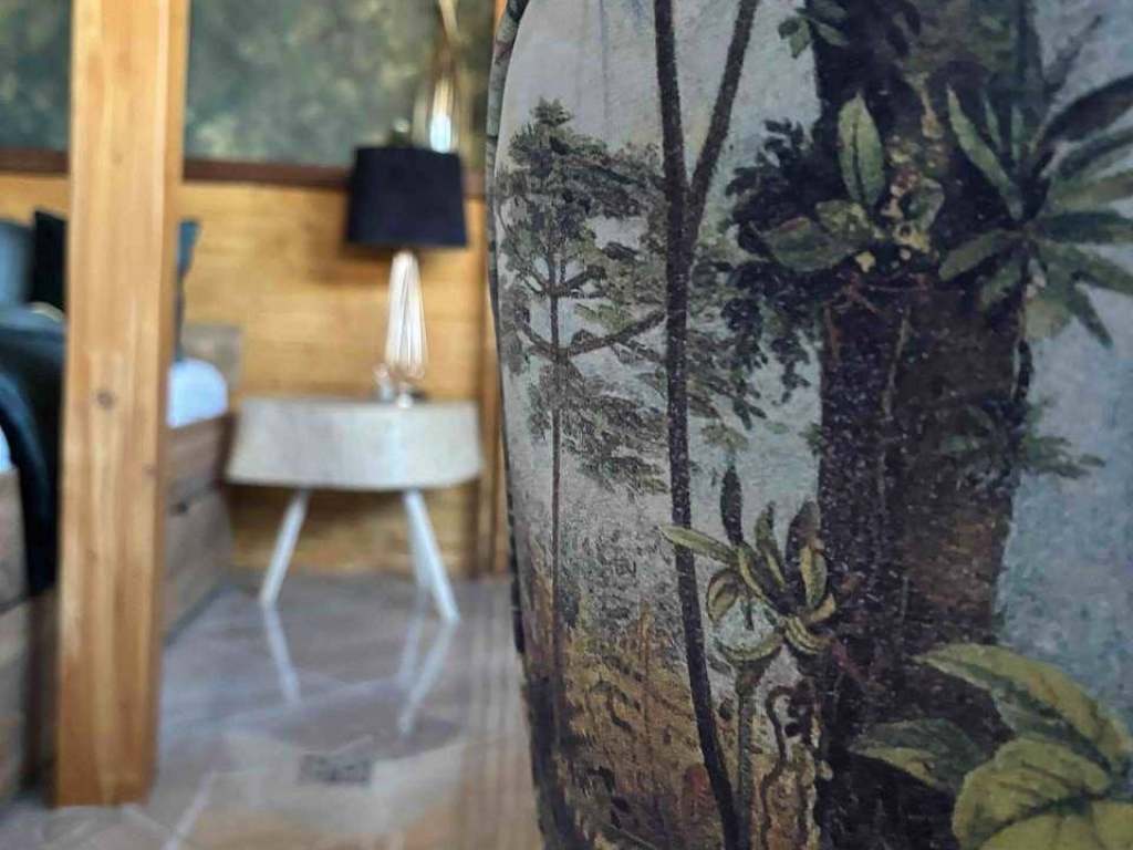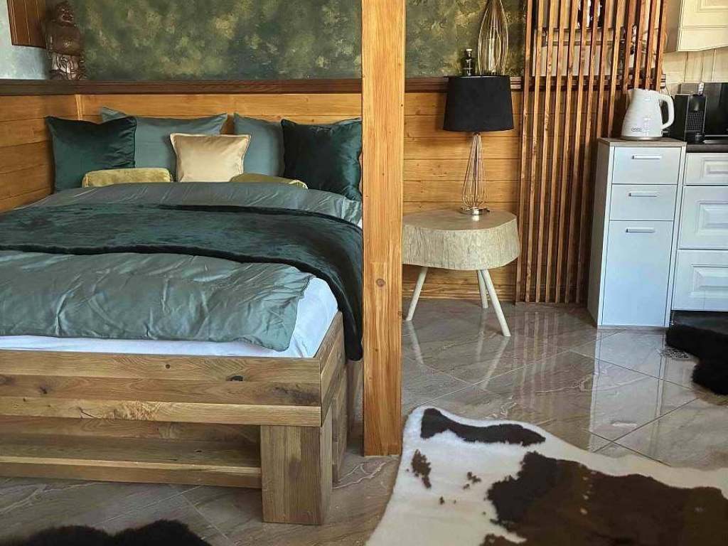 Chata má jeden prostorný pokoj, kde je vše, co potřebujete. Dřevěná postel má velmi kvalitní matraci společně s podložkou, aby bylo vaše pohodlí, ještě měkčí.