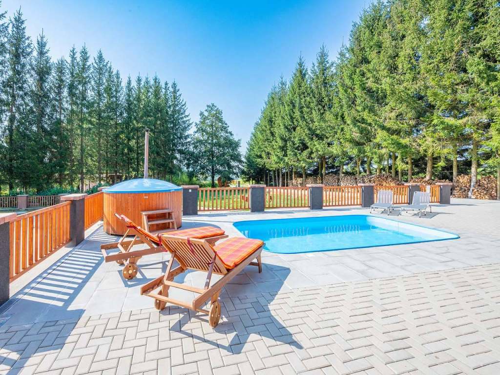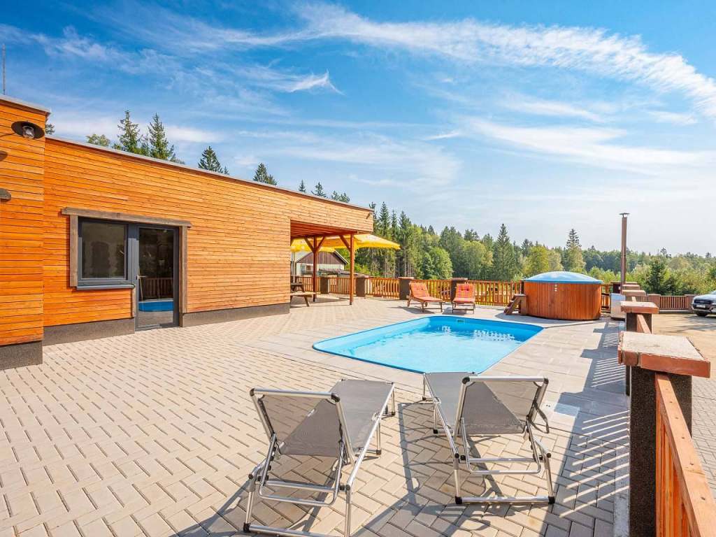 Terasa, zahrada - vyhřívaný koupací sud s vířivkou, bazén se slanou vodou, oplocená zahrada s ohništěm a sezením. Parkoviště u objektu. Venkovní terasa s posezením, lehátky a slunečníky. Venkovní gril.
