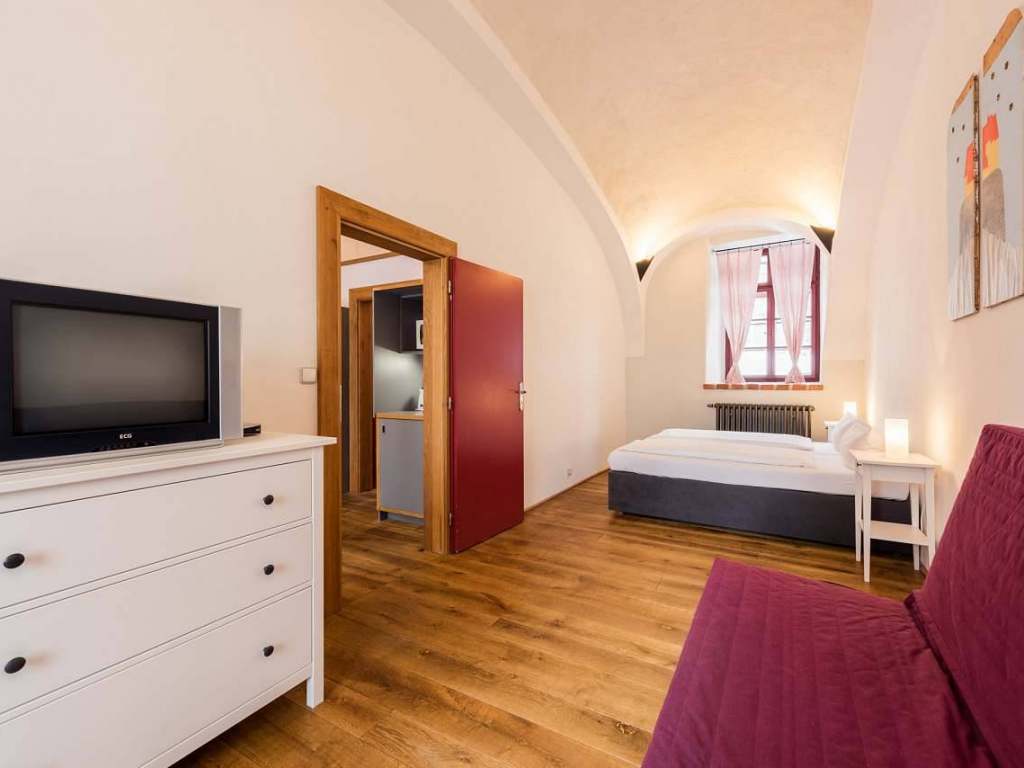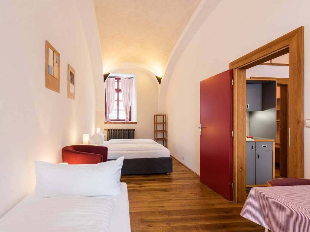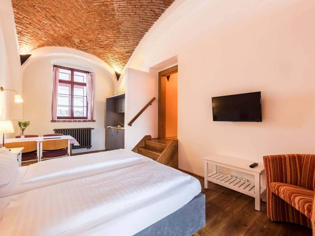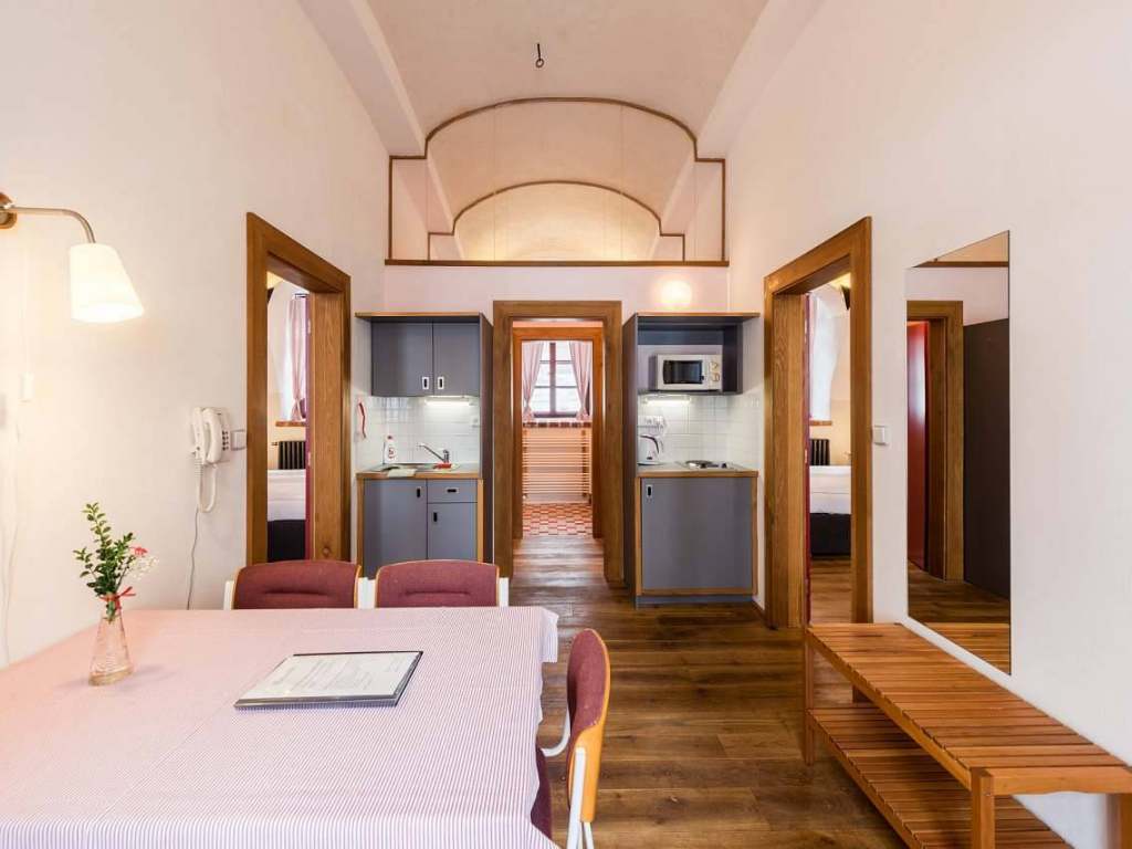 Nabízíme ubytování v apartmánech se snídaní v ceně. Každý z apartmánů má vlastní slunnou terasu se zahradním nábytkem a výhledem na zámek, jeho nádvoří a jezírko. Součástí areálu je velký anglický park a přírodní koupací jezírko. Snídaně probíhá formou bufetu.
